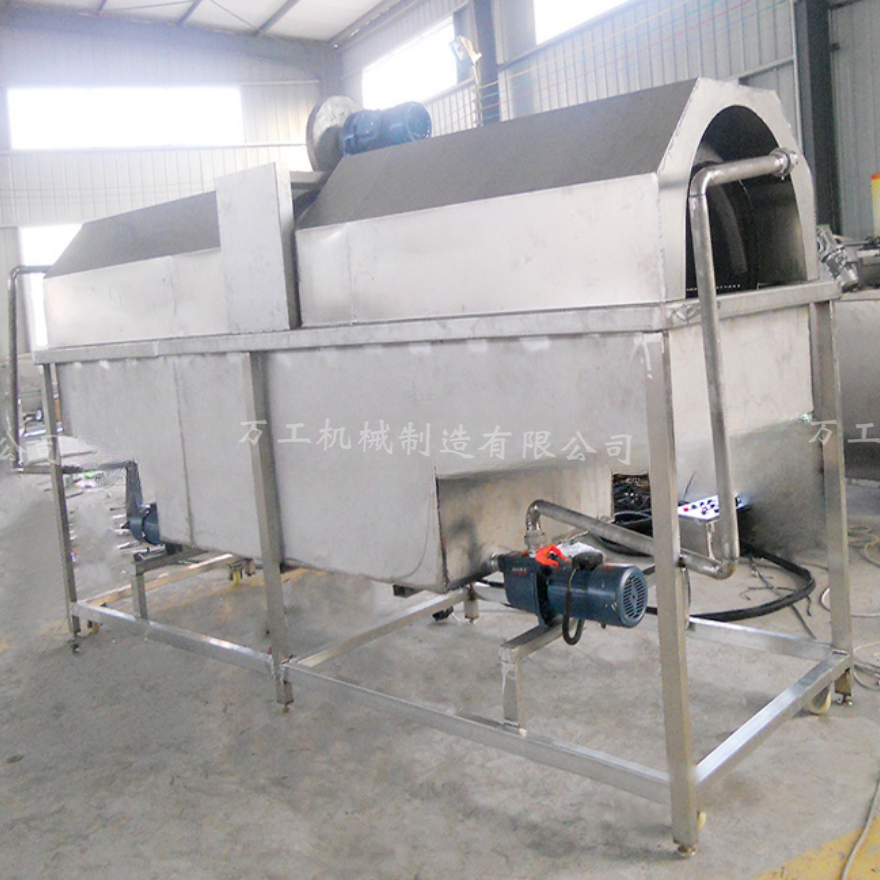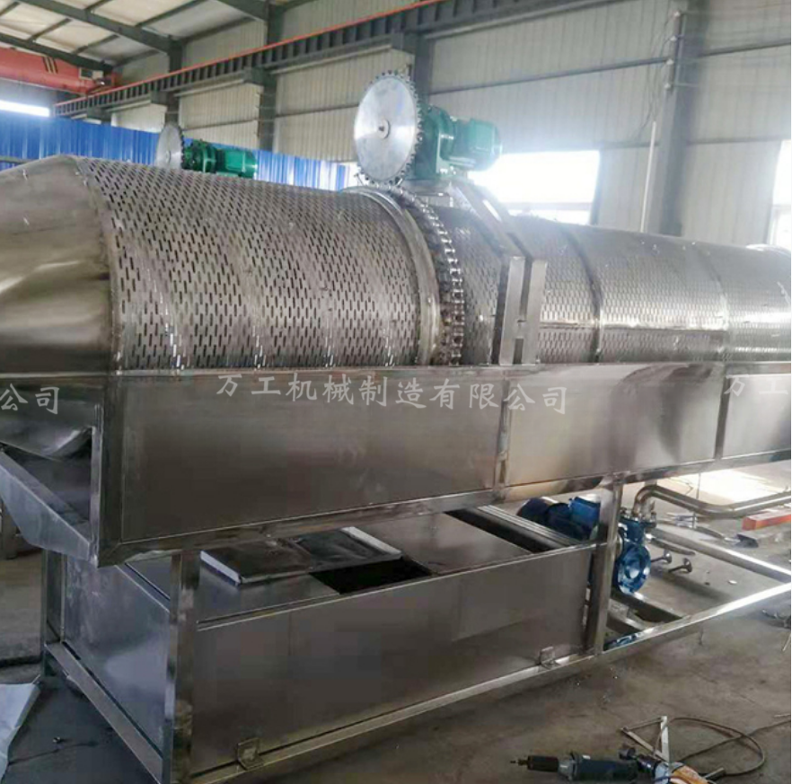5.自動(dòng)控溫,變頻調(diào)速,筒體分為兩部分,前半部采用加洗潔精處理方法,后半部采用清水自動(dòng)清洗一遍。滾筒內(nèi)有毛刷,螺旋進(jìn)料出料,